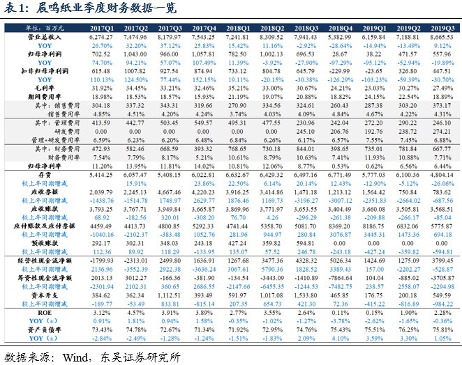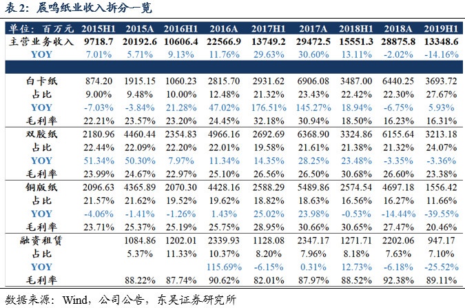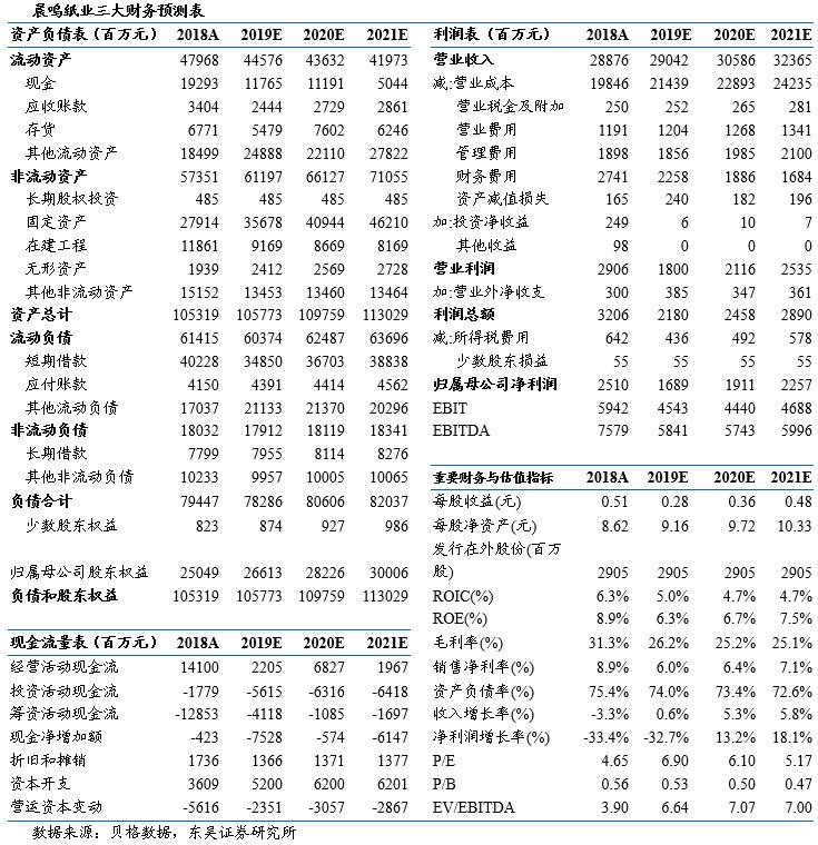 浆纸项目顺利投产,有望支撑销量增长:公司投资建设的寿光美伦51万吨高档文化纸项目、寿光本部文化纸改造项目、寿光美伦100万吨化学浆项目、黄冈晨鸣化学浆项目等已于二季度陆续投产并正常运转,逐步开始发挥效益,预计公司19年底将拥有木浆产能398万吨,机制纸总产能达688万吨,其中双胶纸产能216万吨(+101万吨)。我们认为浆、纸新增产能投产将持续巩固公司销量增长和浆纸一体化成本优势。