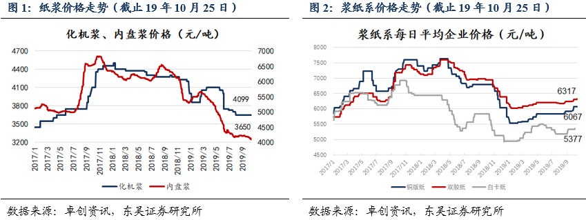 双胶、铜版纸价上扬,业绩环比好转:得益于双胶纸、铜板纸价格的持续上涨,公司盈利水平环比提升:截至10月25日双胶纸6317元/吨,价格较6月30日+117元/吨、较9月30日+75元/吨;铜版纸单价6067元/吨,价格较6月30日+234元/吨、较9月30日+150元/吨。展望四季度,一方面文化/铜板需求文化纸下游需求以教辅印刷为主相对刚性、持续稳健,且从短期来看国内新投产项目较少,竞争格局持续改善,我们认为Q4文化纸价格稳中向上;另一方面全球上游木浆原料库存高企,预计短期内浆价仍将维持低位运行,利好公司成本端结余,看好Q4公司盈利持续向上修复。