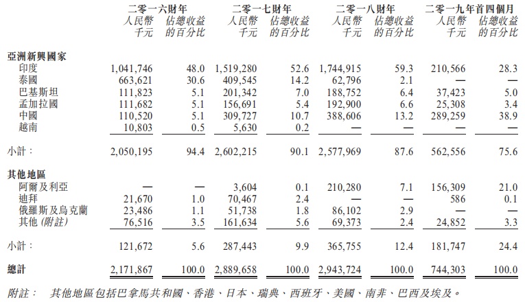 智通财通APP了解到,虽然禾苗科技位列中国第五大手机ODM生产商,不过大部分收入来自海外客户,印度客户贡献了大部分收入。并且,从2016年到2018年来自印度的收入比重从48%增加至59.3%,年复合增长率高达29%。