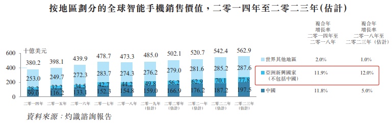 在过去,中国一直是智能手机销量增长的火车头,然而随着市场的饱和,中国市场增速下降,根据灼识咨询的预测,中国市场未来智能手机销量增速从过去的11.8%下降至5%。亚洲其他新兴国家和地区成为了新的火车头,过去5年增速为11.9%,并且未来5年依然保持12%的高增速。