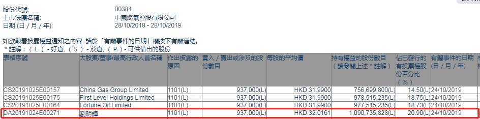 智通财经APP获悉,联交所最新资料显示,10月24日,主席兼执董刘明辉增持中国燃气(00384)93.70万股,每股作价32.0161港元,总金额约为2999.90万港元。增持后最新持股数目约为10.91亿股,最新持股比例为20.90%。