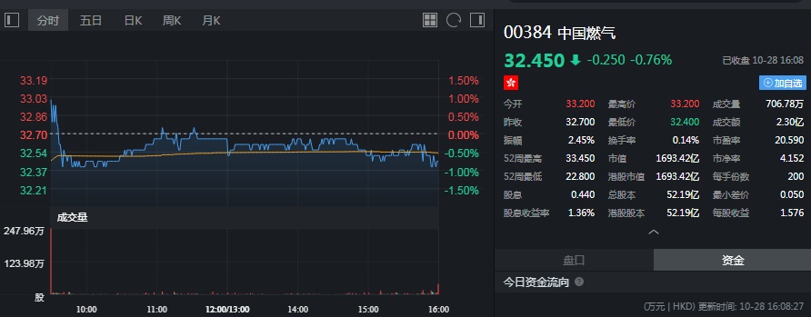 截至今日收盘,中国燃气(00384)跌0.76%,报32.45港元。