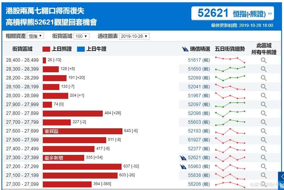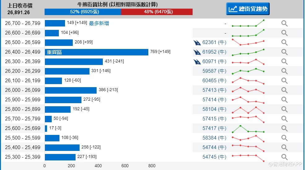 智通财经APP获悉,截至10月29日,恒指最新的牛熊街货比例52:48。瑞信恒指牛熊证街货分布图中的数据显示,熊证街货重货区和最多新增区都在27600-27699区间,该区间最新熊证数量为643张,较上一交易日减少6张;最多新增区间在27300-27399。牛证街货重货区在26400-26499区间,该区间最新牛证数量为769张,比上一交易日增加149张;最多新增区间在26700-26799。