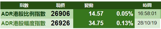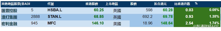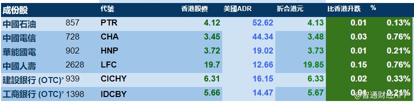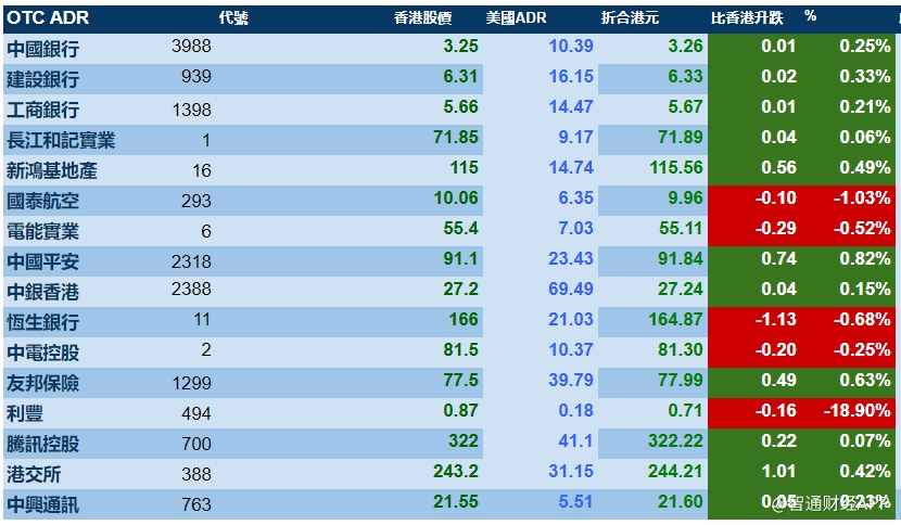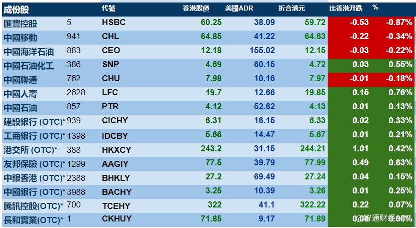 智通财经APP获悉,隔夜美股三大指数收涨,港股ADR指数向上,按比例计算,收报26906点,涨14.57点或0.05%。大型蓝筹涨跌不一,汇丰控股收报59.72元,较港收市跌0.53元;腾讯控股收报322.22元,较港收市涨0.22元。