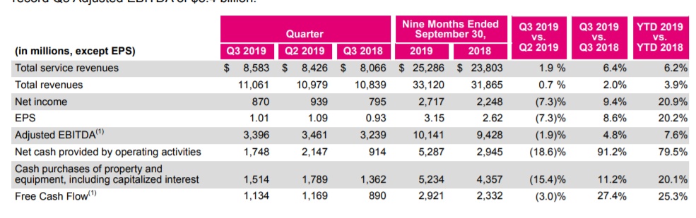 智通财经APP获悉,美东时间10月28日盘后,T-Mobile美国(TMUS.US)公布了三季度财报,报告显示,2019年第三季度TMUS的用户总净增长数为170万,同比增长7%。创下连续26个季度用户总净增长数超过100万的记录。