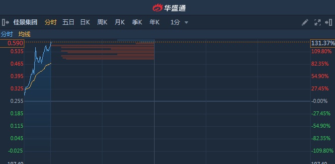 智通财经APP获悉,佳景集团(00703)早盘放量急升,暴涨逾130%,截至10时00分,涨131.37%,报价0.59港元,成交额1253万。