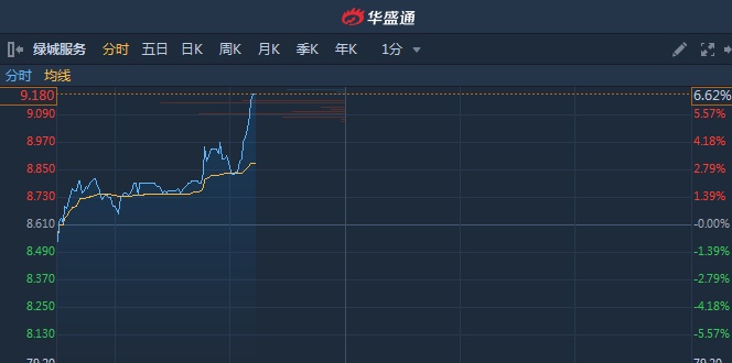 智通财经APP获悉,绿城服务(02869)获里昂看高至9.9港元,评级“买入”,盘中放量急升,突破历史新高。截至11时11分,涨6.62%,报价9.18港元,成交额6417万。