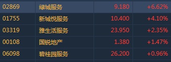 智通财经APP获悉,物业板块集体走强,多只个股盘中,均突破历史新高。截至11时23分,绿城服务(02869)涨6.62%,报价9.18港元,新城悦服务(01755)涨4.1%,报10.4港元,雅生活服务(03319)涨2.35%,报23.95港元,碧桂园服务(06098)涨0.96%,报26.2港元。