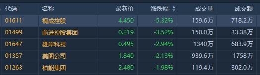 截至发稿,元征科技(02488)跌7.89%,报3.85港元;桐成控股(01611)跌5.53%,报4.44港元;前进控股集团(01499)跌4.88%,报0.78港元;美图公司(01357)跌2.13%,报1.84港元;雄岸科技(01647)跌1.96%,报0.5港元。