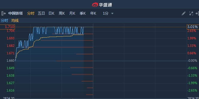 智通财经APP获悉,中国铁塔(00788)首个统筹通信行业海外共建共享项目达成协议,助力股价放量上涨,截至11时41分,涨3.01%,报价1.71港元,成交额3.587亿。