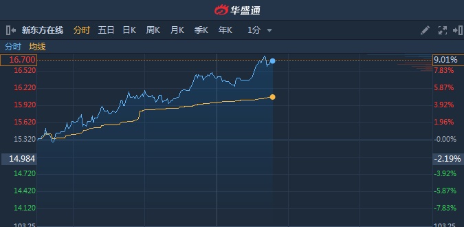 智通财经APP获悉,新东方在线(01797)午后涨幅扩大逾9%,盘中高见16.8港元,再度破顶,截至13时46分,涨9.01%,报价16.7港元,成交额9295万。