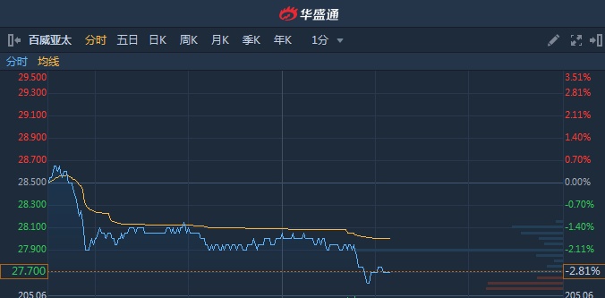 港股异动︱盘中现一宗大手成交涉资5301万 百威亚太(01876)现跌2.8%