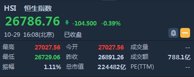 智通财经APP获悉,恒指早盘高开136.3点或0.51%,报27027.56点。截至收盘,恒生指数跌104.5点或0.39%,报26786.76点,全日成交额达788.13亿。国企指数跌0.22%,报10547点,红筹指数跌0.35%,报4298.91点。