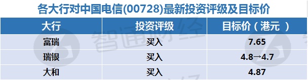 三、各大行对中国电信(00728)最新投资评级及目标价