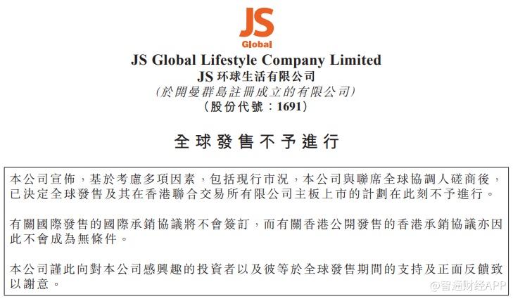 今日(10月29日),JS环球生活正式发布了停止IPO的公告,公司基于当前市况等多种因素,最终决定不进行全球发售及其在香港联合交易所主板上市的计划。