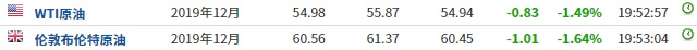 油价连续第二个交易日走低,供应端俄罗斯再度否认正考虑加大减产力度,需求端市场担忧全球经济增长前景,抵消了贸易局势向好预期,WTI原油跌1.49%,报54.98美元/桶。布伦特原油跌1.64%,报60.56美元/桶。