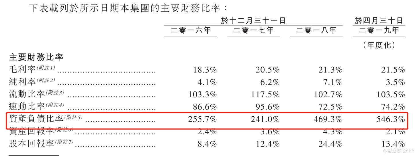 另外2018年末公司的资产负债比率大幅上升。招股书显示,2016年末公司资产负债比率为255.7%,2017年末为241.0%,2018年末则大幅升至469.3%,2019年4月30日又再一次扩至546.3%。