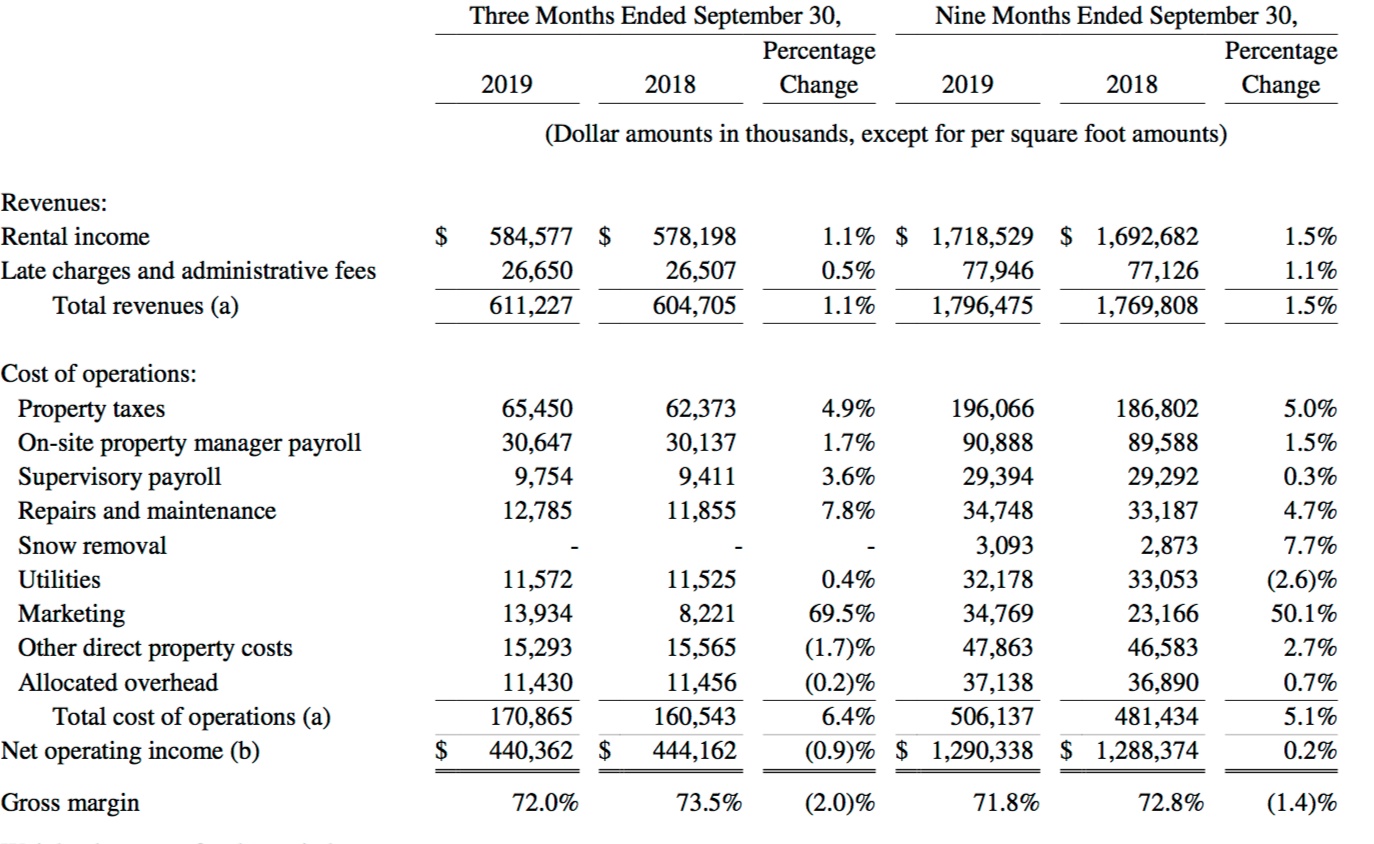 财报显示,该公司第三季度自营仓储净收入增加440万美元,这是由于非同店设施营收增加了820万美元,部分被同店设施营收减少380万美元所抵消。因每平方英尺的实际年租金和更高的使用率,其同店设施营收同比增长1.1%。而营销费用同比增长近七成(570万美元)及财产税增长4.9%(310万美元),导致其运营成本增加6.4%。