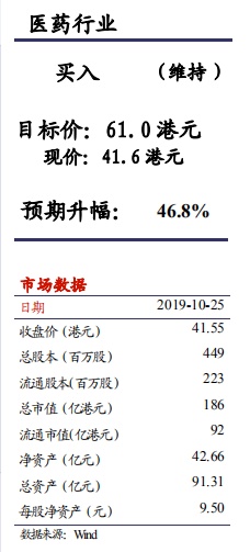 考虑到东阳光药三季度业绩超预期以及良好的销售势头,该行上调对其2019-2021年预测收入至58.14亿元、71.99亿元、90.42亿元,同比增长131.6%、23.8%、25.6%,提升幅度分别为23.1%、22.9%、21.2%;上调2019-2021年预测归母净利润至18.3亿元、22.5亿元、27.9亿元,同比增长94.4%、22.6%、24.2%,提升幅度分别为39.9%、39.0%、38.0%。提高目标价至61港元,对应2019-2020年分别为13.5、11.0倍市盈率,20PEG仅为0.47,较现价有46.8%上升空间,维持买入评级。