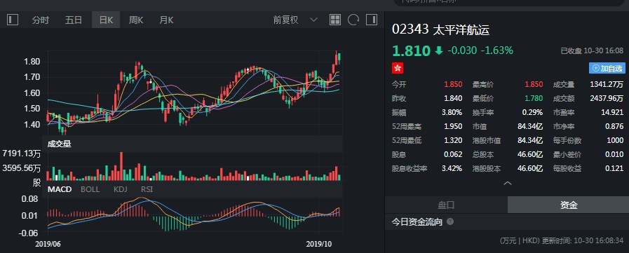 截至今日收盘,太平洋航运跌1.63%,报1.81港元。