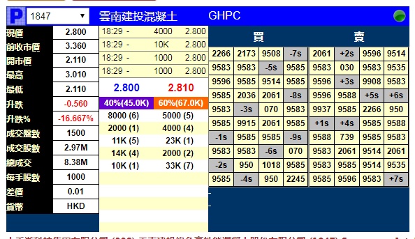 智通财经APP获悉,云南建设混凝土(01847)将于10月31日挂牌,上市前夕,辉立证券暗盘交易显示其收报2.80港元,较招股价3.36港元跌16.667%。每手1000股,不计手续费,每手亏560港元。