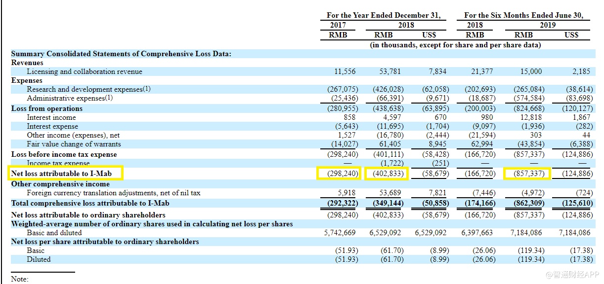 在招股说明书中,天境生物坦言公司自成立以来一直连续亏损,并在可预见的未来无法实现盈利。在2017年以及2018年公司的净亏损分别为人民币2.982亿元以及4.028亿元。而在截至2019年6月30日的六个月中,净亏损达到了人民币8.573亿元,基本上所有的资金都用于研发计划以及运营相关的一般和行政费用。