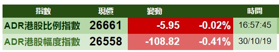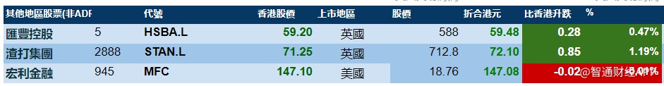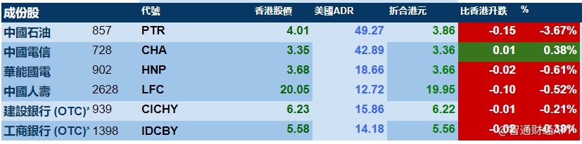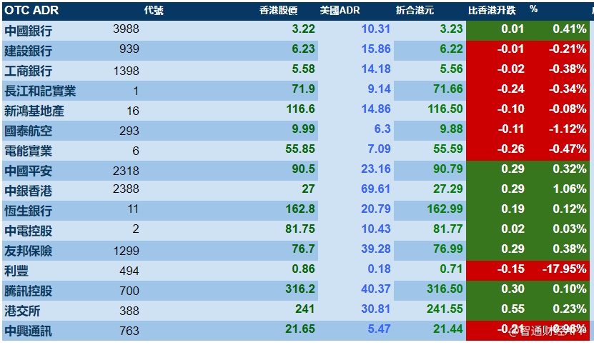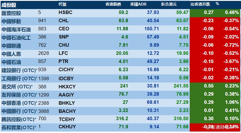 智通财经APP获悉,隔夜美股三大指数收涨,港股ADR指数小幅下跌,按比例计算,收报26661点,跌5.95点或0.02%。大型蓝筹涨跌不一,汇丰控股收报59.47元,较港收市涨0.27元;腾讯控股收报316.5元,较港收市涨0.3元。