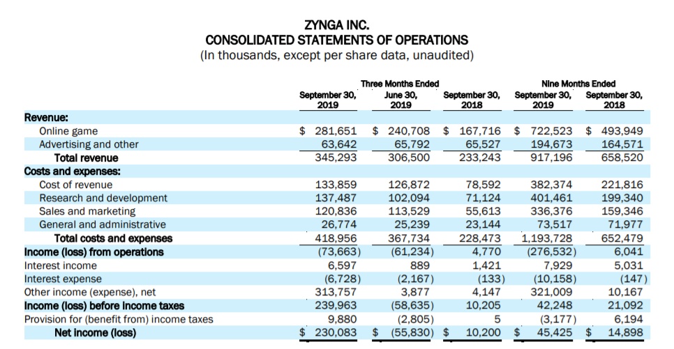 智通财经APP获悉,美东时间10月30日每股盘后,总部位于英国的游戏公司Zynga(ZNGA.US)公布了2019年第三季度财报。报告显示,Zynga第三季度总收入为3.45亿美元,同比增长48%。