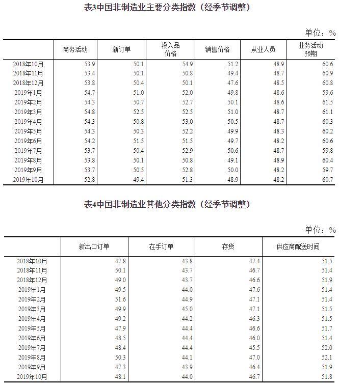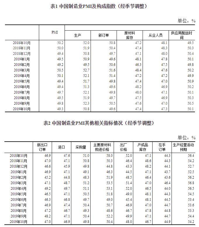 智通财经APP获悉,今日统计局公布2019年10月份中采PMI指数,2019年10月份,中国制造业采购经理指数(PMI)为49.3%,比上月下降0.5个百分点。2019年10月份,非制造业商务活动指数为52.8%,比上月回落0.9个百分点。