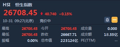 智通财经APP获悉,恒生指数开盘涨40.74或0.15%,报26708.45点。国企指数涨0.2%,报10499.53点。红筹指数跌0.24%,报4257.76点。大市盘前成交18.55亿港元。