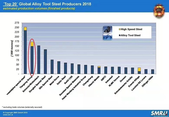 根据专业提供不锈钢和特种钢铁行业市场情报的SMR研究机构最新数据,公司2018年高速钢、模具钢合计近17.5万吨产量已经位列世界第二,较之前的第三有所提升,目前仅次于voestalpine special steel。而且,可以看到世界20强合金工具钢企业中,天工国际高速钢产品的绝对体量,更是独占鳌头。