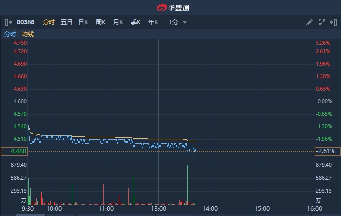 中石化跌2.39%,报4.49港元,成交额3.79亿港元。