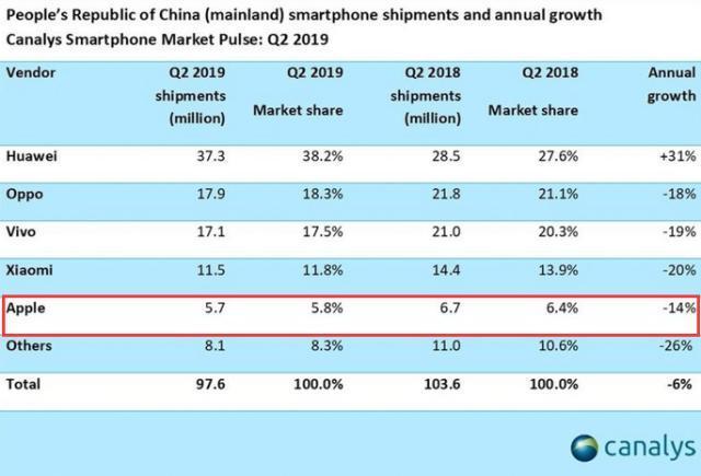 在中国市场,根据Canalys发布二季度国内智能手机市场报告来看,苹果的iPhone销量仍然是进一步下滑。在2018年二季度市场份额为6.4%,到2019年只有5.8%。苹果的iPhone销量在中国市场下滑的最大原因还是因为国产手机品牌的实力跟影响力进一步提升,在性能跟技术上,国产手机华为、小米、OPPO、vivo等品牌在彰显他们手机的竞争力,一定程度上刺激到了消费者购买国产手机的动力。
