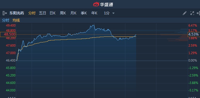 智通财经APP获悉,东阳光药(01558)延续升势,暂现四连阳,累计涨幅达16.7%。截至14时20分,涨4.53%,报价48.5港元,成交额1.493亿。值得注意的是,该股盘中高见49.3港元,创历史新高。