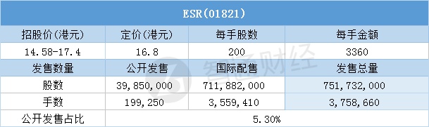 智通财经APP获悉,10月31日,ESR(01821)配售结束。配售招股价区间为14.58-17.4港元,最终定价16.8港元,每手3360港元。