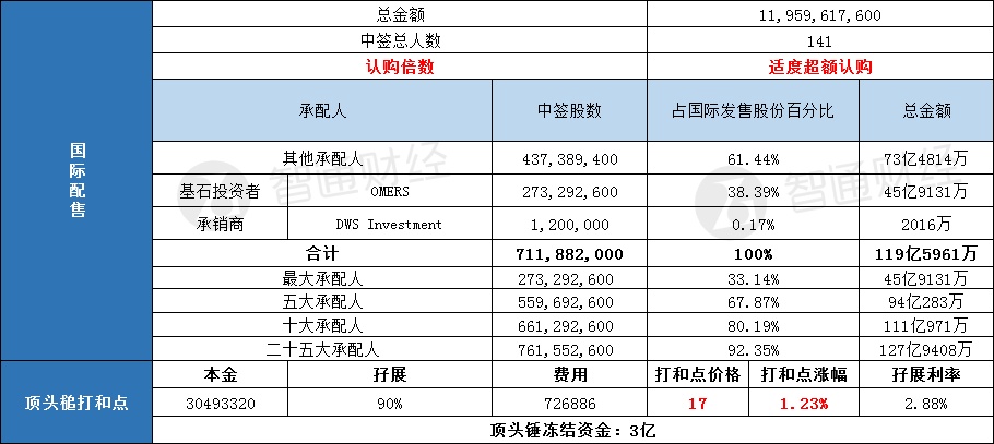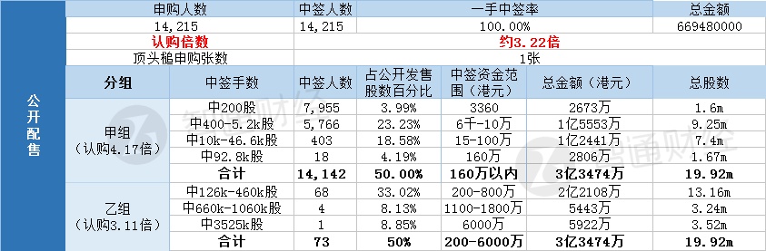 其中,公开配售申购人数14215,一手中签率100%,认购倍数约3.22倍。