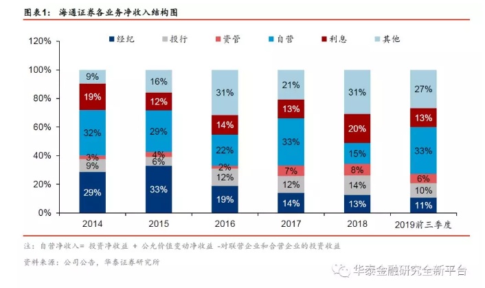 经纪业务通过管理科技赋能和客户经理制度全面推行,实现客户数量稳定增长,并积极推动集团数字化财富管理转型,互联网金融平台活跃用户数量位居前列。2019年前三季度经纪净收入26.9亿元,同比+12%。融资类业务规模领先地位稳固。Q3末融出资金为516亿元,较Q2末和年初分别-1%和+6%,增速略低于市场整体水平;Q3末买入返售金融资产595亿元,较Q2末和年初分别-10%和-28%,延续快速压缩趋势。2019年前三季度利息净收入33.6亿元,同比-12%。2019年前三季度合计计提17.2亿元信用减值损失,其中Q3单季度减值损失6.7亿元,对业绩造成一定拖累。