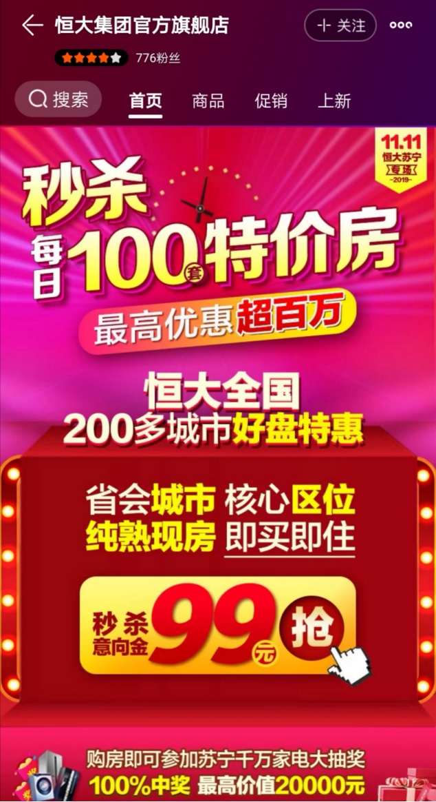 根据合作内容,恒大在苏宁易购平台上的旗舰店也将全面开张,苏宁易购的6亿会员可便捷浏览恒大全国800多个楼盘信息。同时,恒大将借助遍布全国的1万家苏宁易购门店及苏宁小店,进行线下渠道拓展。而苏宁渠道销售团队的16万大区员工,也将通过恒房通平台成为恒大销售顾问。活动期间,消费者不仅可在苏宁易购平台上抢购到恒大超高性价比的专享房源,更有机会抽取价值万元的苏宁家电大礼包。