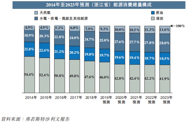 可以说,浙江省在能源优化方面起了排头兵作用。2018年我国煤炭消费占比58.5%,浙江省的煤炭消费占比已经下降至47.6%,并且未来还在不断优化中。