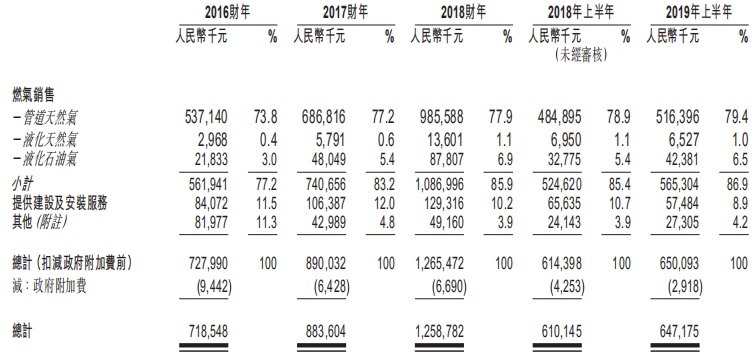 智通财经APP了解到,嘉兴燃气集团的燃气销售主要分成管道天然气、液化天然气和液化石油气三种种类,其中管道天然气占比最大,并且该占比还在逐渐提升。2019上半年,管道天然气收入占比总收入接近80%。