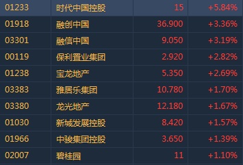 智通财经APP获悉,内房板块近日获野村及中金唱好。截至11时19分,时代中国(01233)涨5.84%,报价15港元,融创中国(01918)涨3.36%,融信中国(03301)涨3.19%,保利置业(00119)涨2.82%,龙光地产(03380)涨1.67%,碧桂园(02007)涨1.1%。