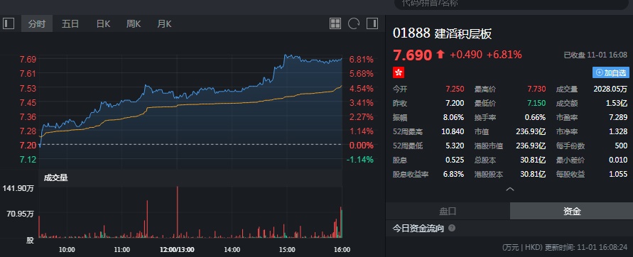 截至今日收盘,建滔积层板涨6.81%,报7.69港元。
