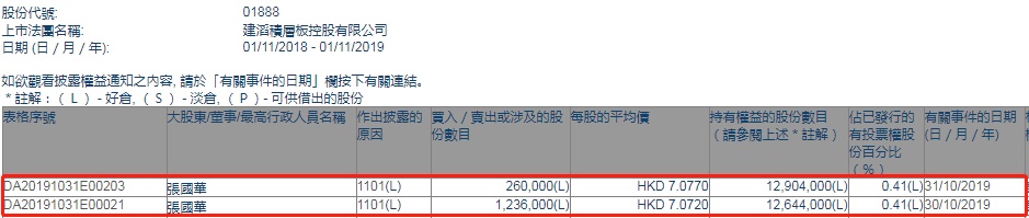 智通财经APP获悉,联交所最新资料显示,主席及执行董事张国华于10月30日、31日分别增持建滔积层板(01888)123.6万股及26万股,共149.6万股,每股作价分别为7.072港元、7.077港元,总金额约为1058.10万港元。增持后最新持股数目为1290.40万股,最新持股比例为0.41%。