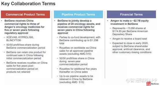 百济神州有权获得每款产品(不包括AMG 510)在中国以外的全球销售的特许使用费;每一款在中国获批的管线药物,百济神州将获得其批准后长达七年的商业化权利;期间,双方将平分利润或亏损;七年商业化期满后,百济神州有权获得五年在中国的特许使用费;并且百济神州有权保留大约每三款获批管线药物中的一款,总计至多六款(不包括AMG 510),以在中国进行商业化;期间,双方将共同承担盈亏。
