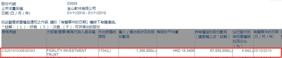 智通财经APP获悉,联交所最新资料显示,10月25日,FIDELITY INVESTMENT TRUST减持金山软件(03888)130.8万股,每股作价18.34港元,总金额为2398.872万港元。减持后最新持股数目为6785.89万股,最新持股比例为4.94%。