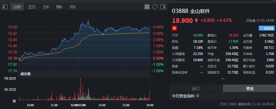 截至今日收盘,金山软件(03888)涨4.42%,报18.90港元。