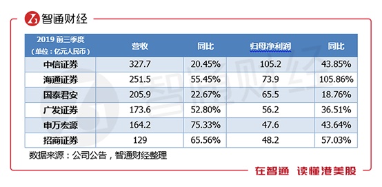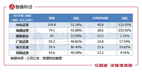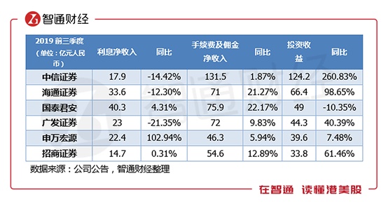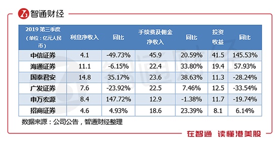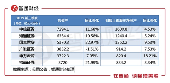 近日,中信证券(06030)、海通证券(06837)、国泰君安(02611)、广发证券(01776)、申万宏源(06806)以及招商证券(06099)等一众头部中资券商,均公布了2019年前三季度的业绩答卷,其中资产规模、经营收入以及净利润齐刷刷的大幅增长,吸引了无数投资者的目光,但在各数据细节对比中,各龙头券商经营表现其实很不一样。