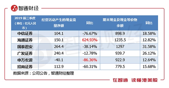 2019年前三季度经营活动现金流方面,海通证券则是由去年同期的净流出,转为净流入150.1亿元,同比变动幅度达6倍多;剩余其它券商现金流净流入均出现下滑。而在手现金及等价物方面,各大券商现金余额规模均录得较大幅度增长,其中国泰君安不仅31.58%的同比增长是最快的,高达1297亿元的在手现金体量也同样位列第一。