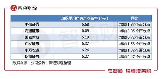 截止2019年三季度,除国泰君安5.19%的加权平均资产收益率低于6%外,其它龙头券商整齐划一的全部超过了6%,其中以大龙头中信证券6.68%的净资产收益率位列第一。同比变化方面,海通证券3.05个百分点的同比增长位列第一,而净资产收益率排在末位的国泰君安,0.72个百分点同比增长同样位列最后。