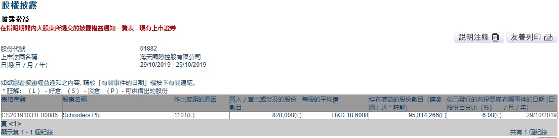 智通财经APP获悉,联交所最新资料显示,10月29日,Schroders Plc增持海天国际(01882)